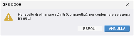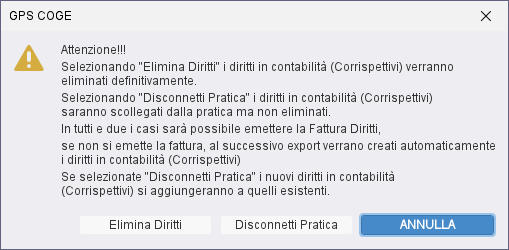 Il pulsante Elimina Diritti in Contabilità in questo caso risulta attivo in modo da permettere la cancellazione o il distacco dalla pratica del corrispettivo, cliccando sul pulsante compaiono una serie di messaggi: