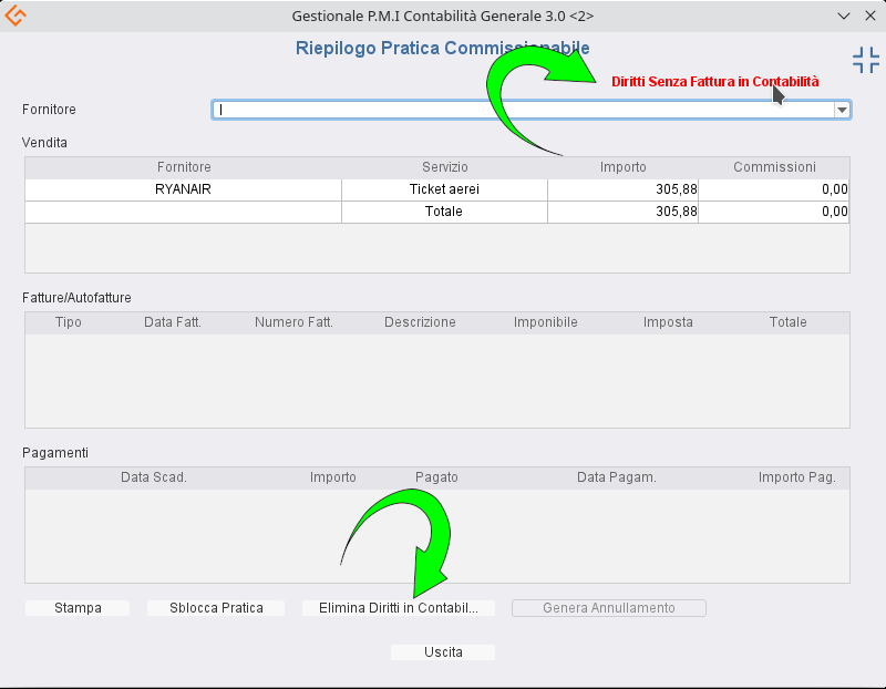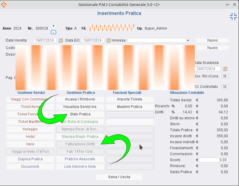 Attenzione usando Disconnetti Pratica e successivamente Fatturazione Diritti, avrete due scritture ad iva in contabilità quindi, se i diritti erano di 100 €, in contabilità avrete un importo complessivo di 200 €.