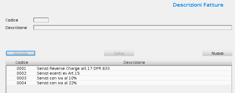 Per modificare i contenuti della casella a discesa e stato aggiunto un modulo nel menu Impostazioni Generali/Descrizioni Fatture: