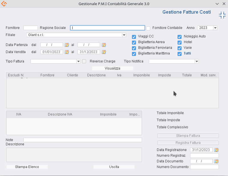 Il modulo successivo viene aperto anche dal modulo Fatture Elettroniche, la differenza è che aprendolo dal menu  Gestione Fatture Costi i contenuti sono tutti manuali mentre dal menu Fatture Elettroniche molti campi risultano precompilati, come, ad esempio, Fornitore, Date, Importi Totali nel riepilogo in basso a destra che si colorano in bianco quando gli importi totali corrispondono a quelli della fattura che si sta registrando.