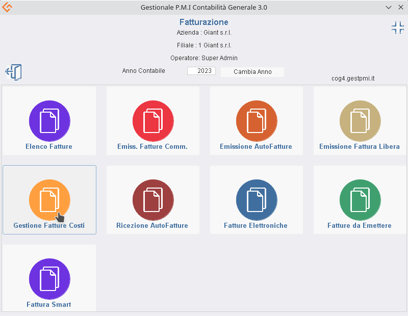Per accedere alla gestione fatture costi, dal menù principale, cliccate su Fatturazione: