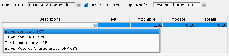 Se nel passo precedente, come tipo fattura, avete selezionato Costi Servizi Generali e, come tipo notifica, un valore diverso da Nessuna, il campo descrizione della tabella, seppur non necessario per le scritture in contabilità, sarà utilizzato nella generazione delle autofatture di notifica che dovendo essere inviate al’ SDI creerebbero uno scarto se lasciata anche solo una riga senza descrizione.