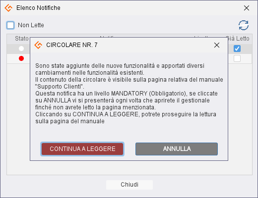 Le righe dell’elenco hanno a sinistra un pallino bianco per le notifiche già lette e uno rosso per le notifiche non ancora lette o su cui non si è cliccato sul tasto “OK HO LETTO”, che sia in locale o sulla pagina del manuale.