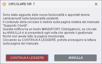 In questo caso il pulsante attivo conterrà la dicitura “CONTINUA A LEGGERE” che vi porterà alla pagina relativa. - MANDATORY – Si tratta di messaggi molto importanti di cui è obbligatoria la lettura, il non leggerlo potrebbe comportare danni ai vostri dati dovuti a problemi di tipo logico o di non osservanza delle regole dell’agenzia delle entrate. Sarà sempre necessario accedere alla relativa pagina del manuale o della sezione DOMANDE FREQUENTI.